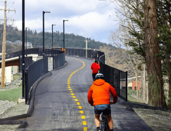 No more will cyclists have to detour from the trail along Wale Road and the Island Highway, wait to cross at the light, then follow the sidewalk before getting back on the Goose. Now they can just go over the highway.