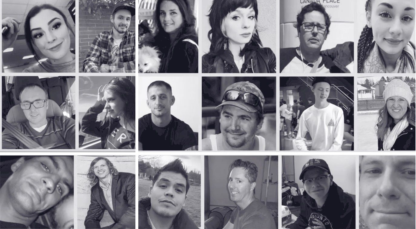 The faces of some of the people killed by BC’s toxic drugs supply, now on display at the Bay Centre as part of the Naming a Crisis art show. Image: Naming a Crisis