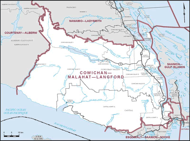 This is a vast riding first contested in 2015. It has been held by the NDP's Alistair MacGregor since then. The riding is split fairly evenly between the Cowichan Valley and Langford portions of the riding. Candidates have been campaigning in both, and whoever is elected would likely maintain the current approach of having two different constituents' offices.
