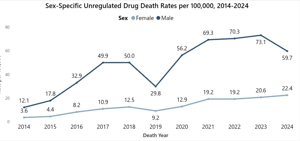 Last week's drug toxicity numbers from the BC Coroners Service brought 2024 stats to the year's halfway mark. While this year is tracking to have fewer deaths than last, the Island specifically is on pace for its deadliest year yet, and there are still six fatal drug deaths in BC every day. There are already about as many Island deaths as in the entirety of 2017 or 2018.
