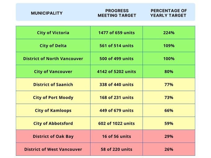 Now, Housing Minister Ravi Kahlon has released the first progress report and Victoria leads the pack with 1,477 units built vs. an expected first-year pace of 659. That's 224% of the year target and nearly a third of the way to the 5-year total goal. Saanich is 5th overall with 338 vs. a target or 440 (77%).