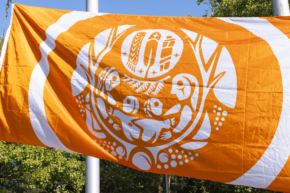 Survivors’ Flag flies at the campus of UVic. Photo: University of Victoria