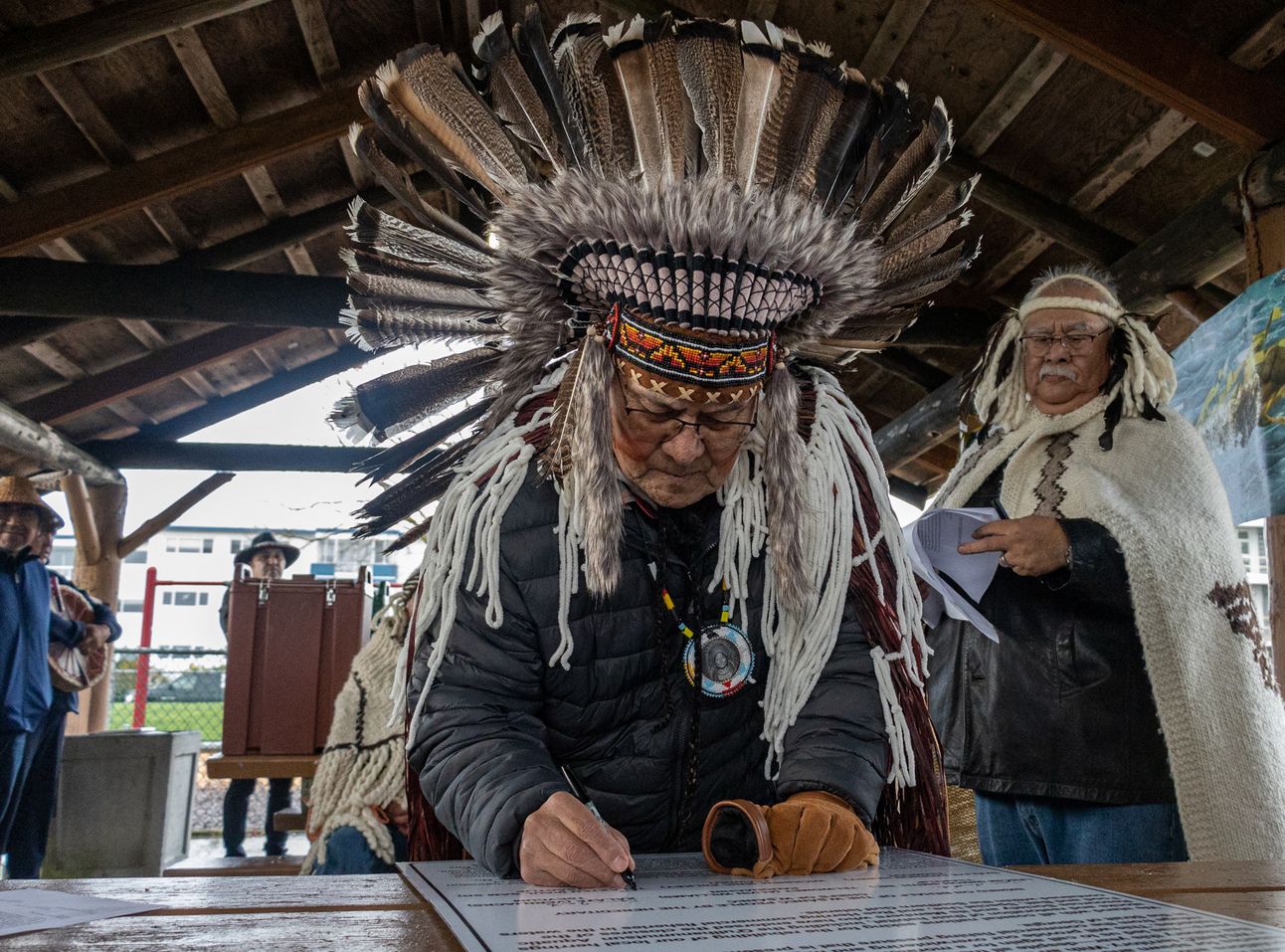Tsartlip Nation Hereditary Chief Paul Sam Sr. (TELAXTEN) signs a declaration calling for a halt to herring fisheries, on Nov. 13, 2024. Photo: Robyn Bell / Capital Daily