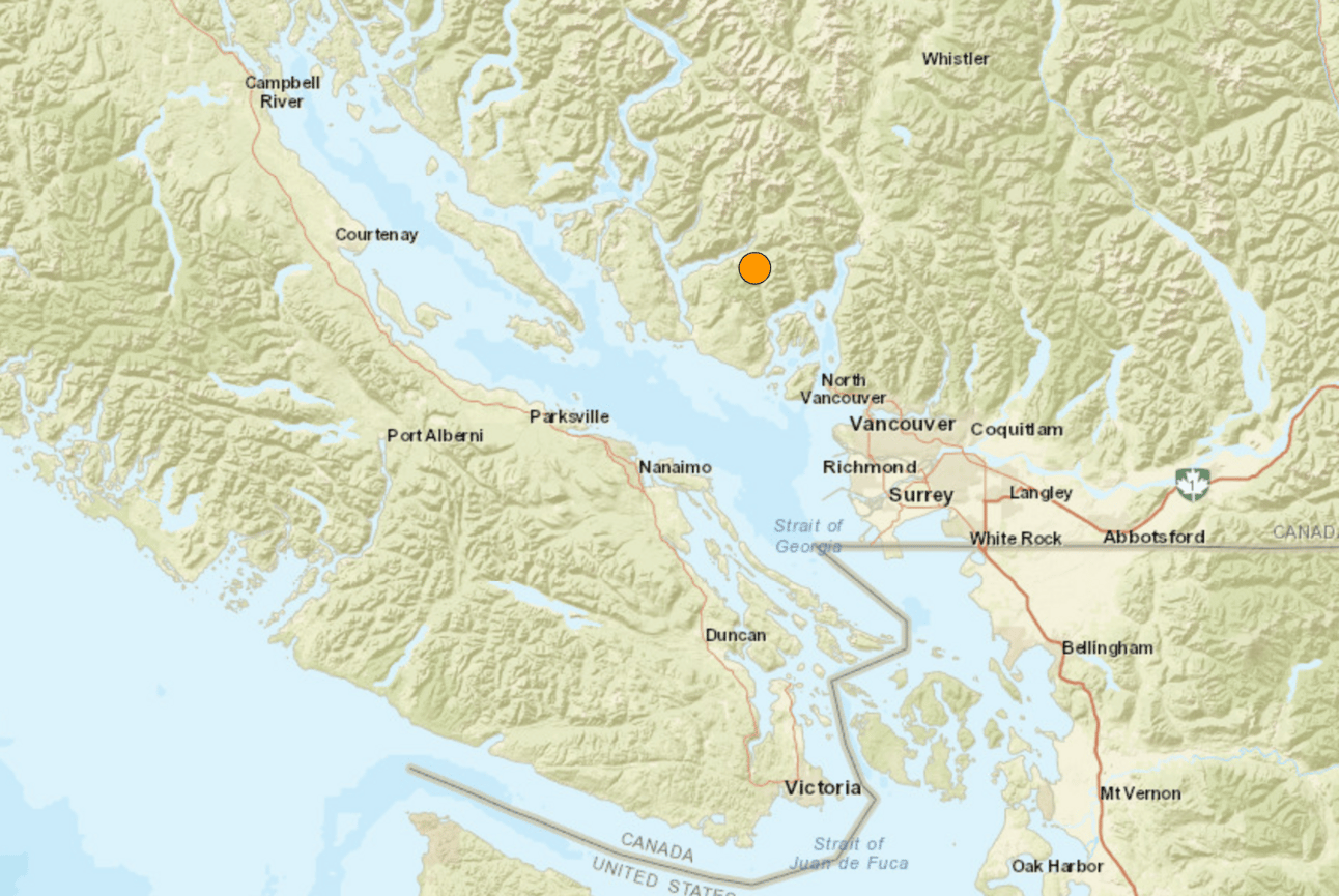 Yesterday’s earthquake struck 24km NE of Sechelt. Image: US Geographical Survey