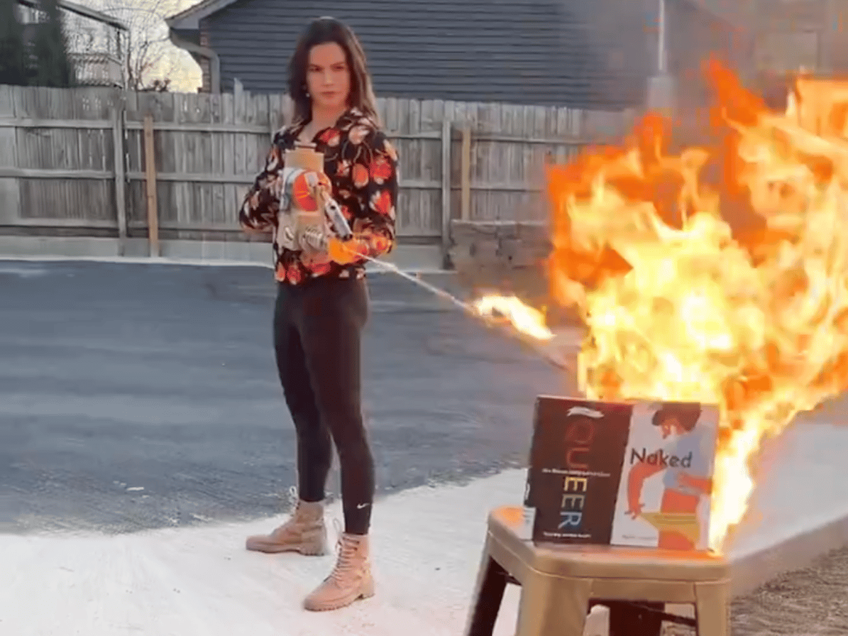 Missouri Republican candidate Valentina Gomez burns educational books for teens—including one published by Orca—in a 2024 campaign video. Photo: Valentina Gomez / X (Twitter)