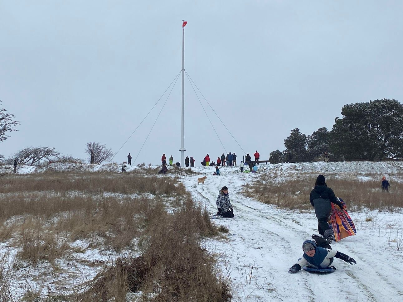 It was a snow day for many yesterday—including the young ones, some of whom were afforded the rare and most welcome opportunity to toboggan or sled down Beacon Hill.