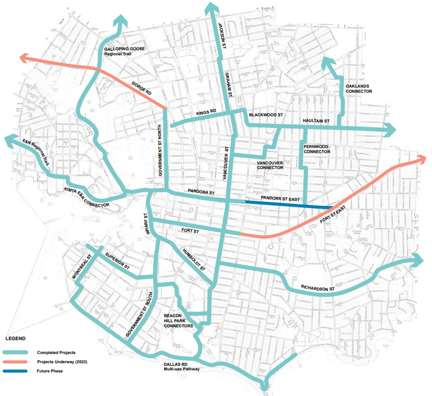 According to city statistics, 13% of all resident trips in 2022 were completed on a bicycle, compared with 9% in 2017. Those ridership numbers are based on the CRD Origin and Destination Household Travel Survey and bicycle count data from locations across the city’s cycling network from both automatic counters and general traffic counts.