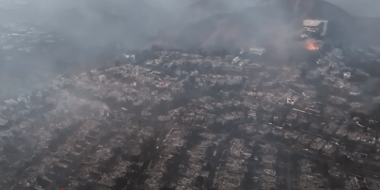 Drone view of some of the devastation in LA. Screenshot: NY Post/Youtube