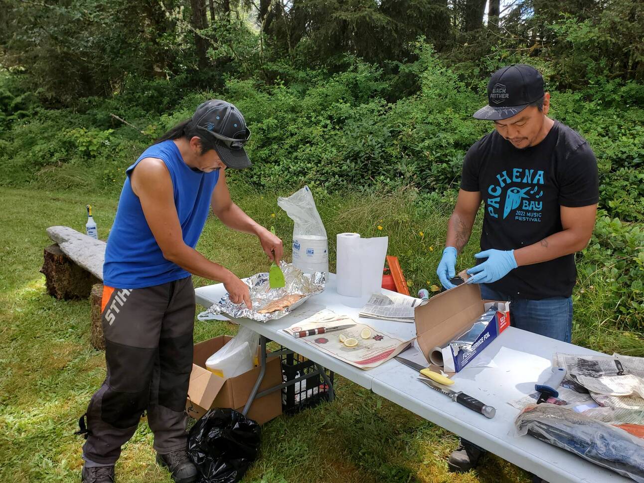 Huu-ay-aht First Nation guardians cook salmon for hikers in summer 2022. File photo: Jolene Rudisuela / Capital Daily