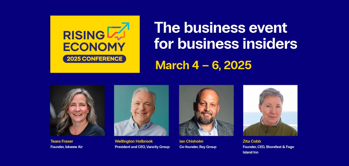 An aviation innovator, a trailblazing changemaker, and an expert economist are among the keynote speakers for Rising Economy. Get your pass and see Iskwew Air's Teara Fraser, Shorefast's Zita Cobb and RBC's Rachel Battaglia, and others. Learn how their insights can shape your business success. Presented in partnership with PacifiCan.