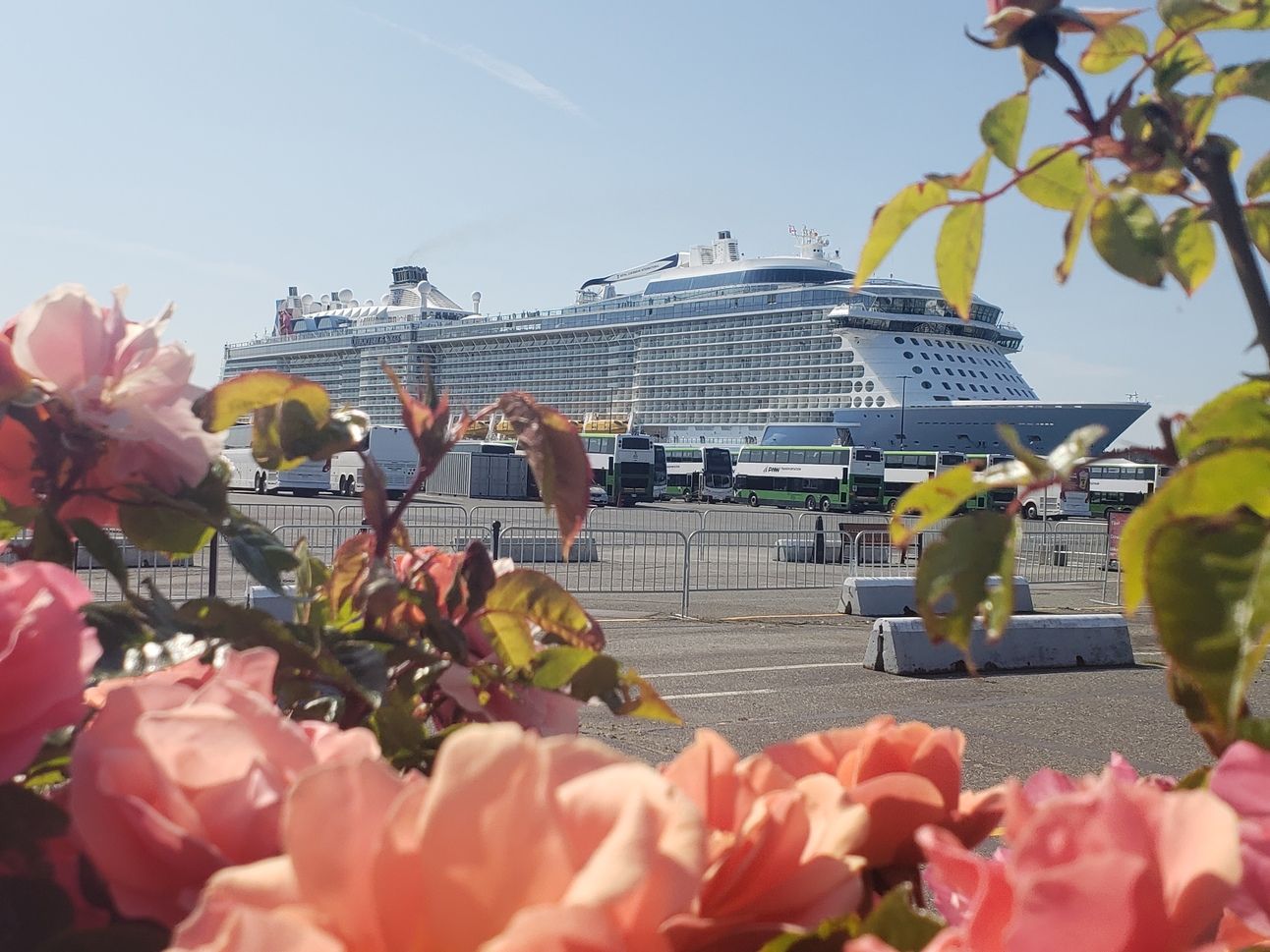 Also present at Ogden Point yesterday was the cruise ship Quantum of the Seas, pictured below as seen through some Breakwater District flowers: