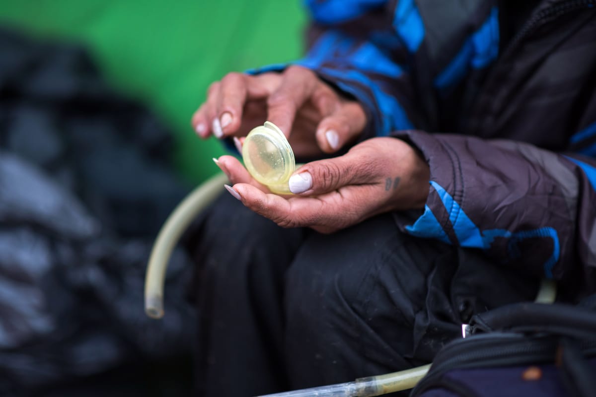 A person uses drugs on Pandora, 2021. Photo: James MacDonald / Capital Daily