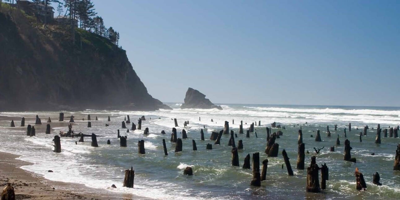 The Neskowin Ghost Forest in Oregon; one of many stands of dead trees on the West Coast killed by the effects of a violent 1700 earthquake and tsunami (Flickr.com / Rob DeGraff).