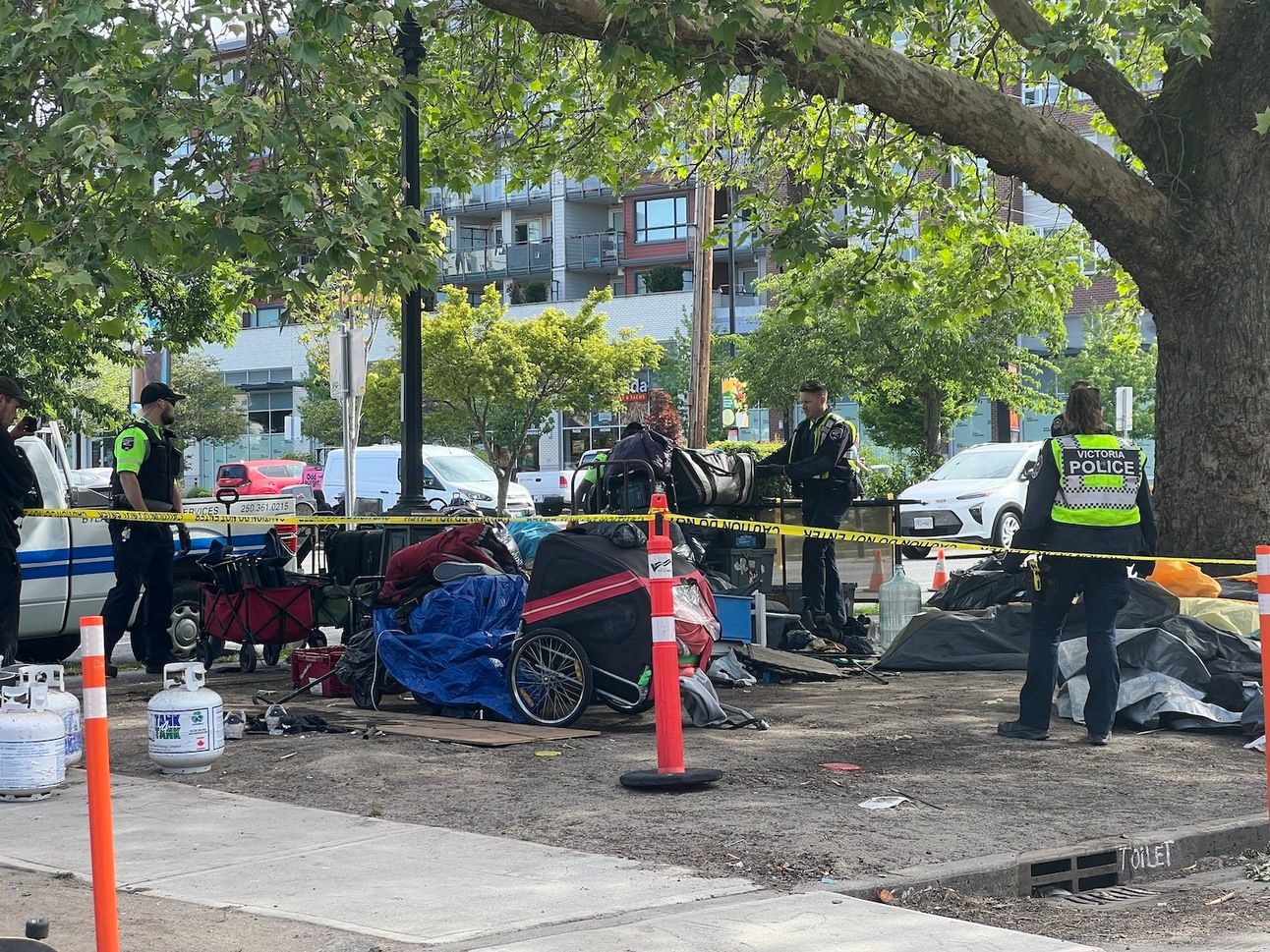 Bylaw officers sweep Pandora on May 16. Photo: Grant McKenzie / Our Place Society