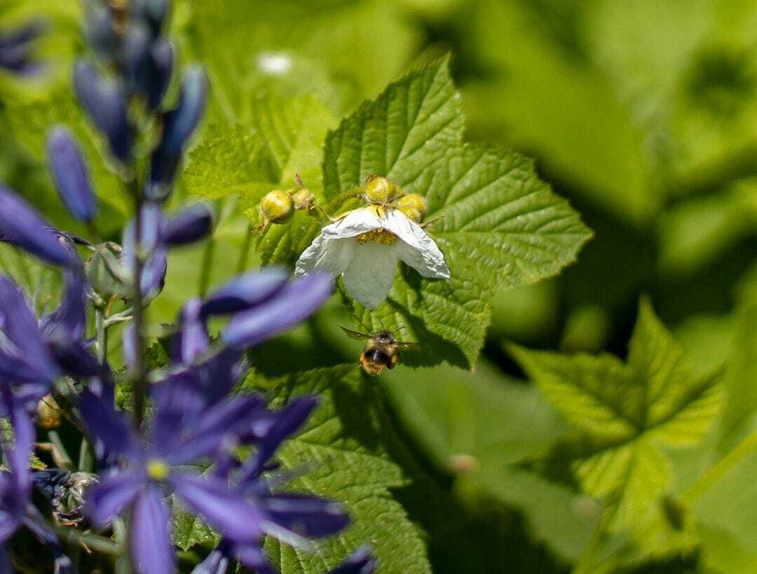 A bumblebee buzzes toward an endemic flower at Fort Rodd Hill. Photo: Robyn Bell / Capital Daily