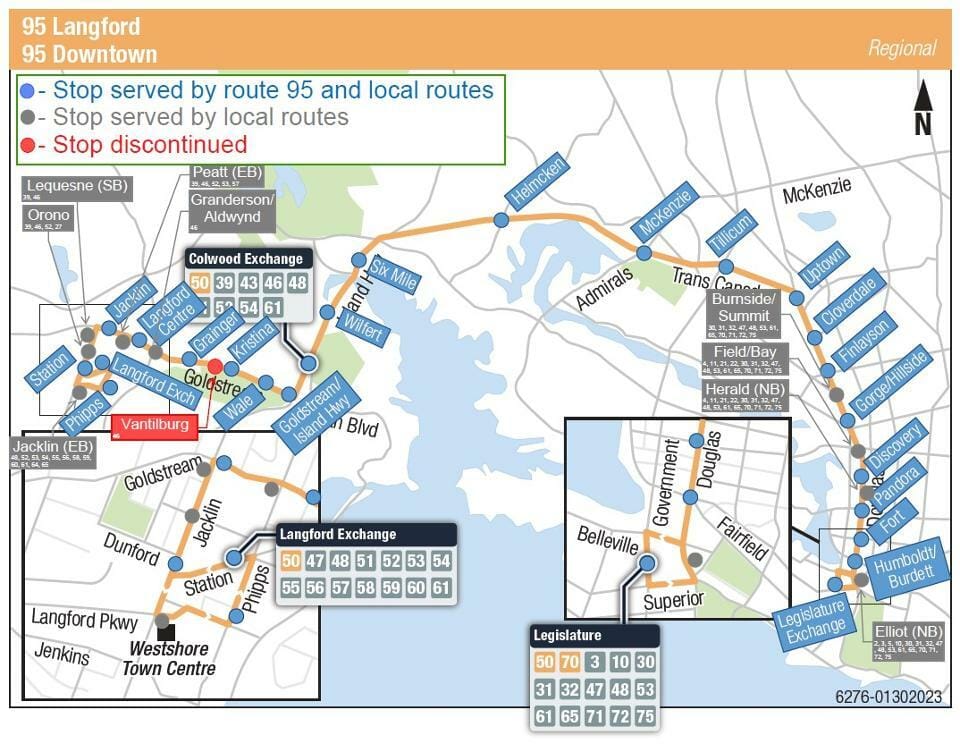 The bus stops cut from the 95 route are in the Langford core and on Douglas; most are just a block or two from other stops, but the Burnside/Summit and Bay removals will likely be the most noticeable. BC Transit said it was judicious with these cuts, keeping an average of 600m between stops rather than the 800m+ standard.