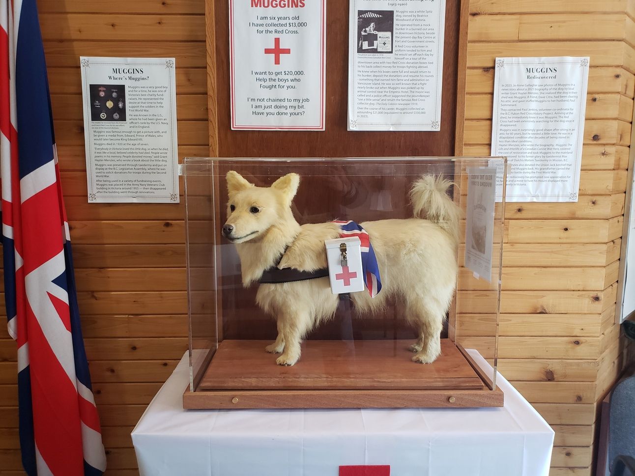 By WWII, the dog's taxidermied body was still being used for fundraising. But that body then disappeared for 60+ years, until being found recently. After refurbishment, Muggins was put on permanent display this summer at the Trafalgar / Pro Patria Legion Hall on Gorge.