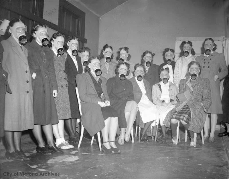 Victoria students pose with gas masks in this 1943 photo. City of Victoria Archives.