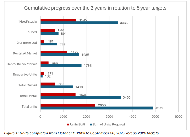 As of the end of September, 2,359 new units had been built—equal to 48% of the objective to build 4,902 new homes by fall 2028, the city said in its latest target update.
