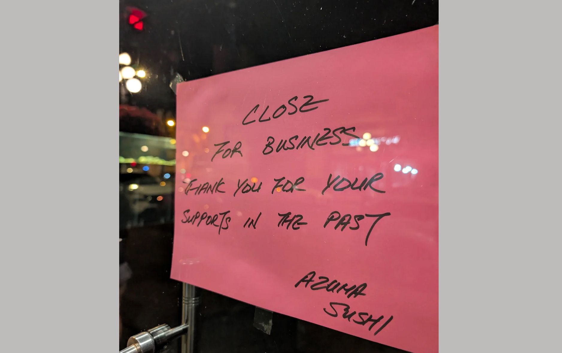 Closure sign posted on the door of Azuma Sushi, one of several downtown Victoria restaurants to have closed recently. Photo: Reddit