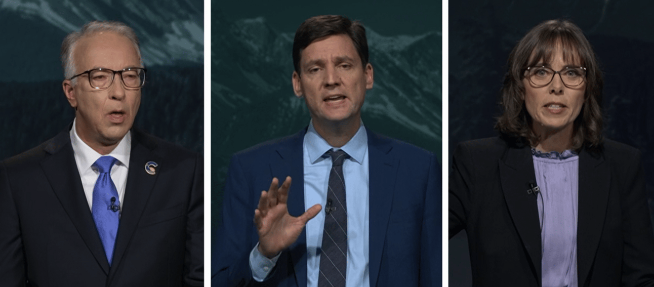 (L-R) Conservative John Rustad, New Democrat David Eby, and the Green's Sonia Furstenau. Screenshot courtesy CBC