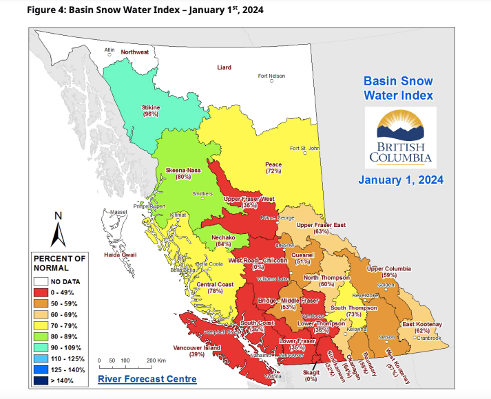 Overall, BC’s snowpack on Jan. 1 was 56% of normal, down from 82% the previous year, and 15 stations reported their lowest New Year’s Day levels ever recorded.