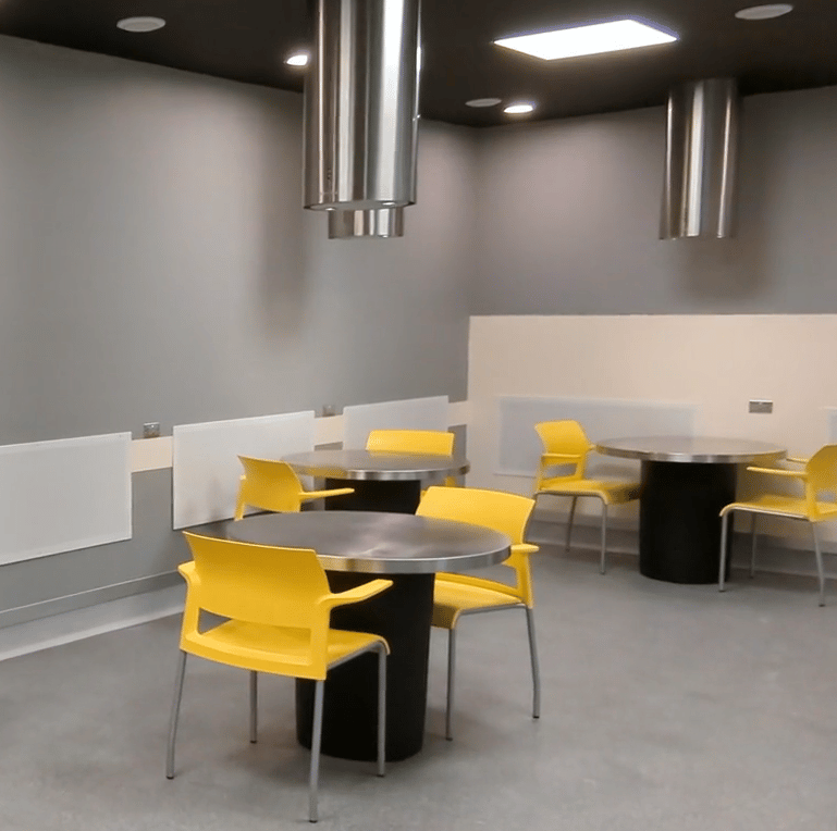 The enclosed consumption room has six metal-surfaced tables with source-capture hood fans hanging above to suck up the smoke. Using the latest technology, the air is filtered to a powerful HVAC (heating, ventilation, and air conditioning) system located in another part of the building. Island Health said it has renovated the building to make the air safe for staff, clients, and members of the public, and it has minimized noise levels.